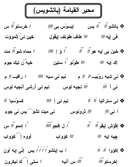 + اف اوش ايفول انجو امموس: جى اكؤواب أووه اكؤواب: اكؤواب ابشويس ان نى ايه اون: خريستوس انيستى اكنكرون.