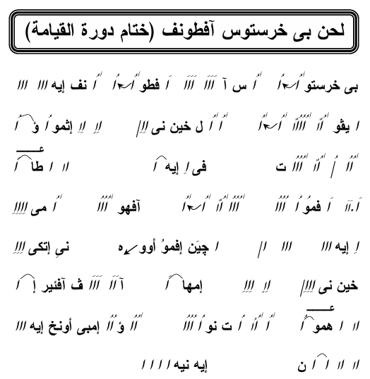 + بي خريستوس افتونف ايفول خين ني ايث موؤت: في ايطاف مو افهومي ايجين افمــو: اووه ني اتكي خين ني امهـاف: افئير اهــموت نوؤ امبي اونخ ان اينيه.